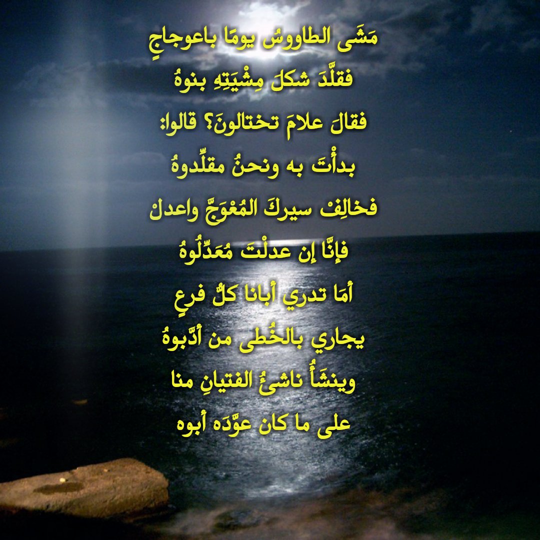 O Xrhsths عبداللطيف بن محمد المهيني Sto Twitter مشى الطاووس يوما باعوجاج فقل د شكل مشيته بن وه فقال علام تختالون قالوا بدأت به ونحن مقل دوه فخالف سيرك المعوج واعدل فإن ا إن