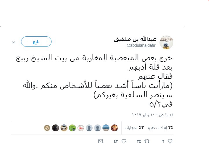 كشف المستور على تويتر قال ربيع المدخلي عن المغاربة الذين عارضوه في بيته مارأيت ناسا أشد تعصبا للأشخاص منكم والله سينصر السلفية بغيركم لا تنسى يا ربيع أن محمد بن هادي ابنك تربى