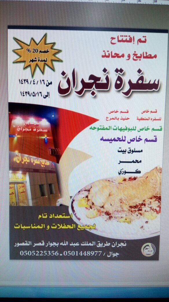 اعلانات نجران En Twitter تم افتتاح مطاعم سفرة نجران طريق الملك عبدالله الرديف بجوار قصر القصور 0505225356