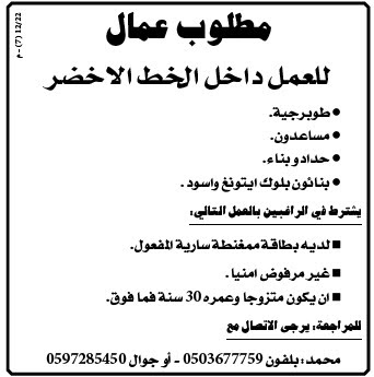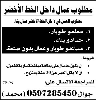 وظائف فلسطين مطلوب عمال للعمل داخل الخط الاخضر