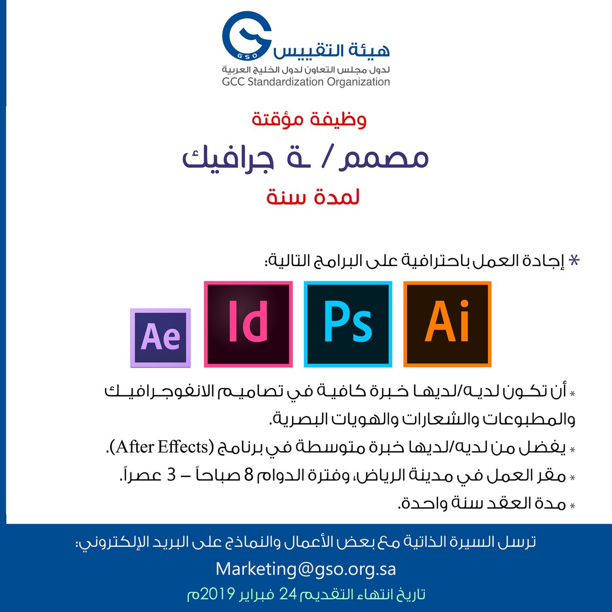 وظائف للسعوديين على تويتر هيئة التقييس تعلن عن مطلوب مصمم ة جرافيك للعمل بـ بوظيفة مؤقتة حسب الشروط الموضحة ارسال السيرة الذاتية بعض الأعمال والنماذج على البريد الإلكتروني هيئة التقييس وظائف نسائية وظيفة شاغرة