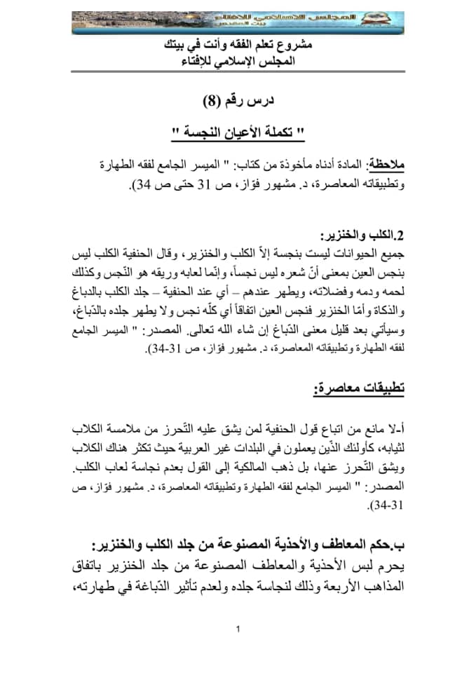 المجلس الإسلامي للإفتاء الداخل الفلسطيني 48 الدرس 8 تكملة الأعيان النجسة