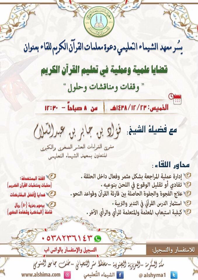 دعوة من معهد الشيماء التعليمي لمعلمات القرآن مباركة الدورالنسائية