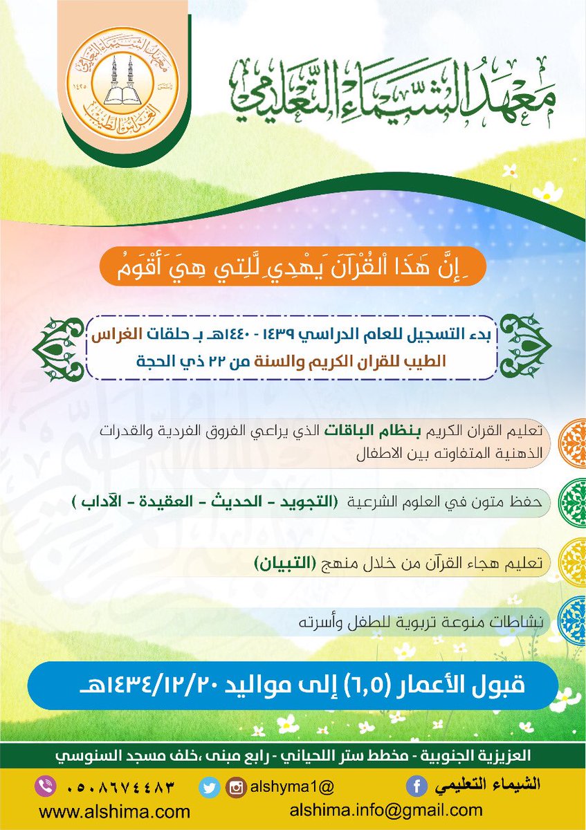 معهد الشيماءالتعليمي No Twitter بكل الود والترحيب نستقبلكم للتسجيل في البرامج القرآنية التعليمية ١٤٣٩ ١٤٤٠هـ بدءا من الأحد ٢٢ ٢٦ذوالحجة بالحضور الشخصي في مقر المعهد Https T Co Dcy5xq6rbi معهد الشيماء التعليمي Https T Co Hndw14mhds