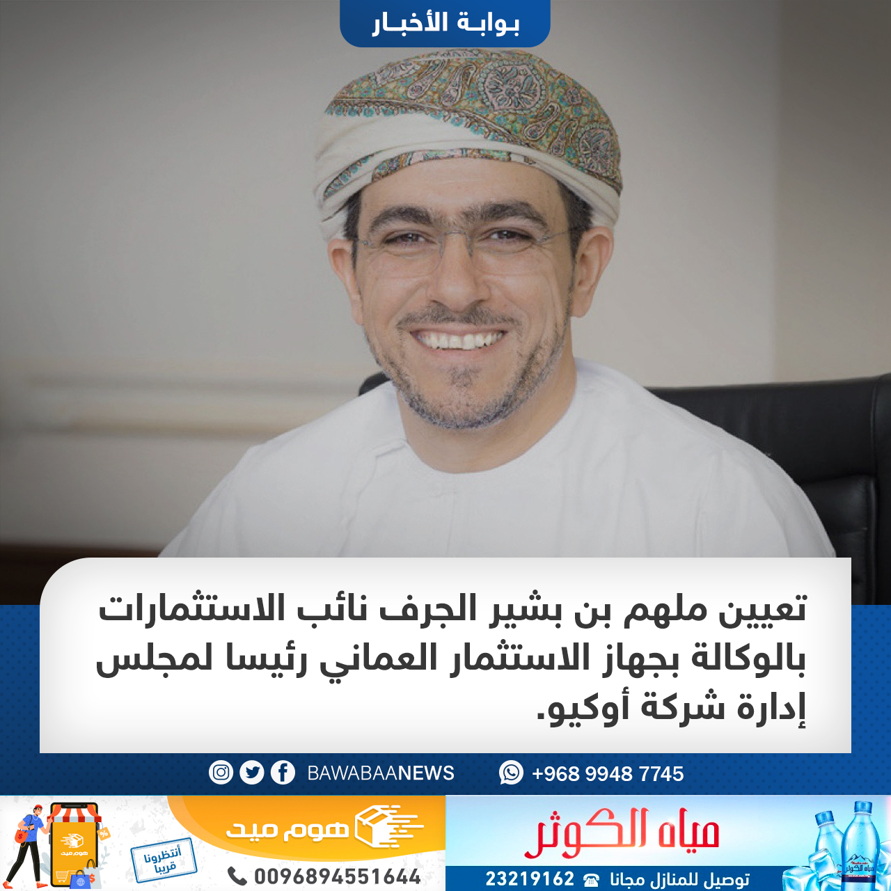 موقع بوابة الأخبار تعيين ملهم بن بشير الجرف نائب الاستثمارات بالوكالة ب جهاز الاستثمار العماني رئيسا لمجلس إدارة شركة أوكيو ع مان بوابة الأخبار