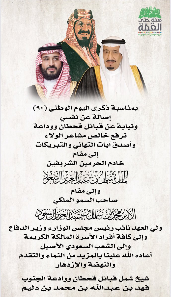 دلـيـم بن دلـيـم On Twitter شيخ شمل قبائل قحطان و وادعة فهـد بن عبدالله بن محمد بن دليم يرفع تهنئته لسيدي خادم الحرمين الشريفين الملك سلمان بن عبدالعزيز ولسمو سيدي ولي العهد الأمير محمد بن سلمان بن عبدالعزيز وإلى الأسرة المالكة والشعب
