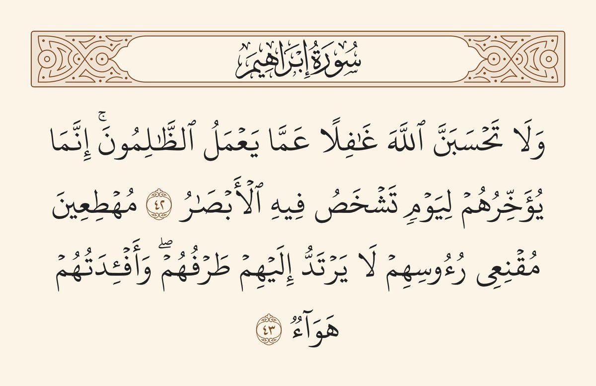 ولا تحسبن الله غافلا عما يعمل الظالمون إنما يؤخرهم ليوم تشخص فيه الأبصار مهطعين مقنعي رؤوسهم