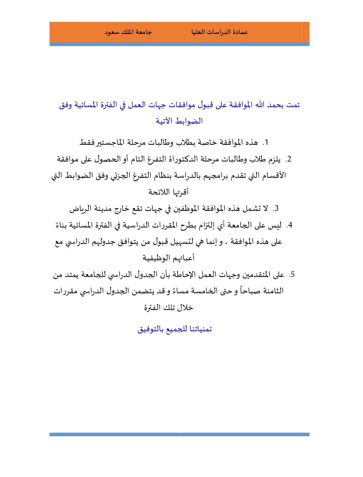 د صالح آل صقر On Twitter تمت بحمد الله الموافقة على قبول موافقات جهات العمل للدراسة في الفترة المسائية للدراسات العليا وفق الضوابط المرفقة وفق الله الجميع Https T Co 2xrmgmw4ic